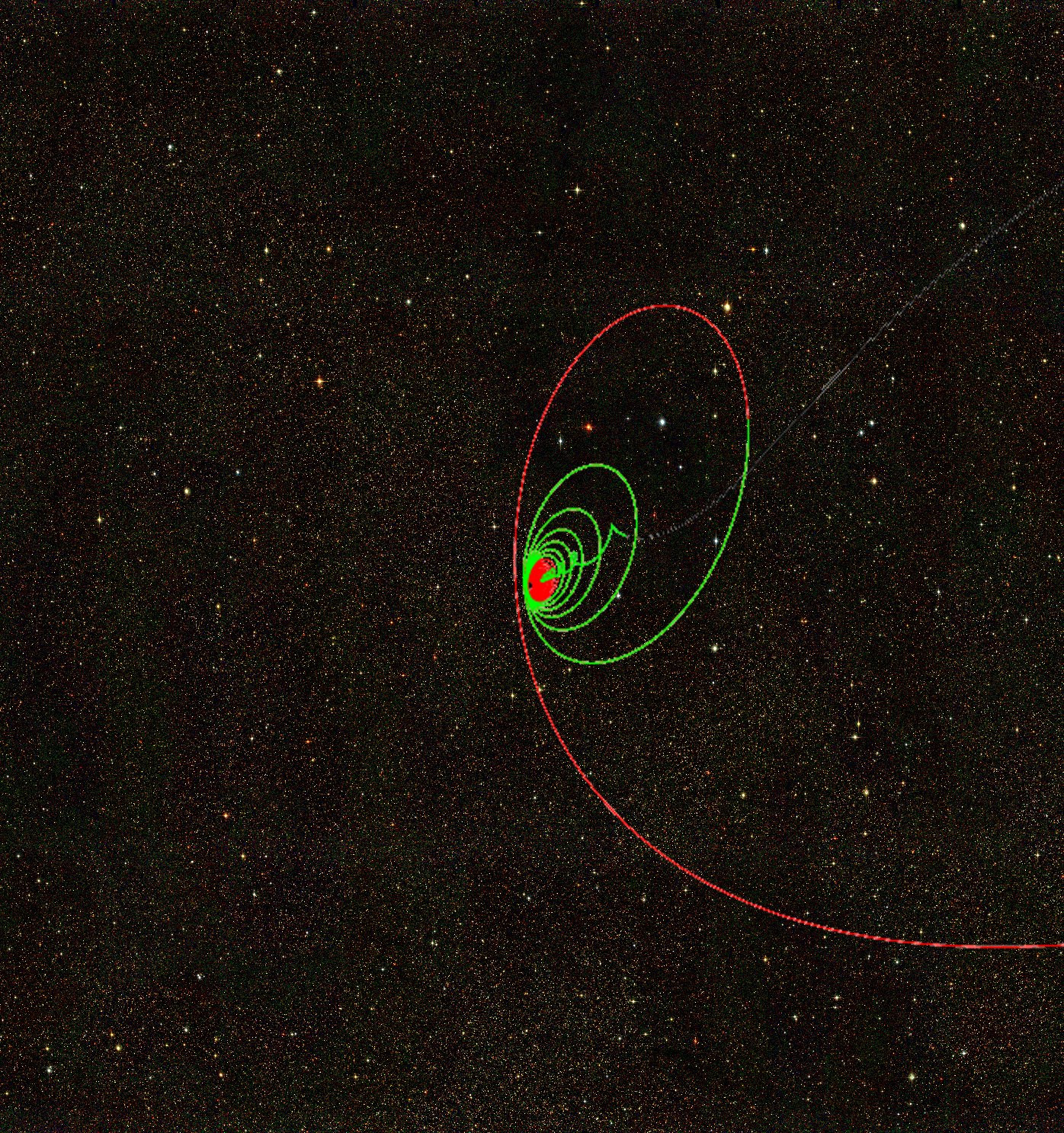Courtesy Canada France Hawaii Telescope: CFHT data taken as Director’s Discretionary time. The line shows the position of Pluto as seen by the spacecraft with respect to the background stars. The colors indicate times: green indicates the interval to between 45 and 6 days pre-encounter when the search for hazardous debris occurred. Credits: Stephen Gwyn, Canadian Astronomical Data Center.