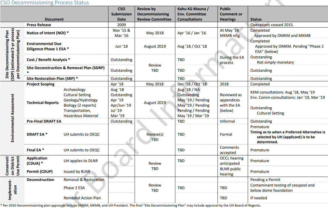 First, taking down CSO was discussed at Tuesday’s meeting. Office of Mauna Kea Management director Stephanie Nagata gave an overview of the decommissioning process, which was also covered in this submittal document:
