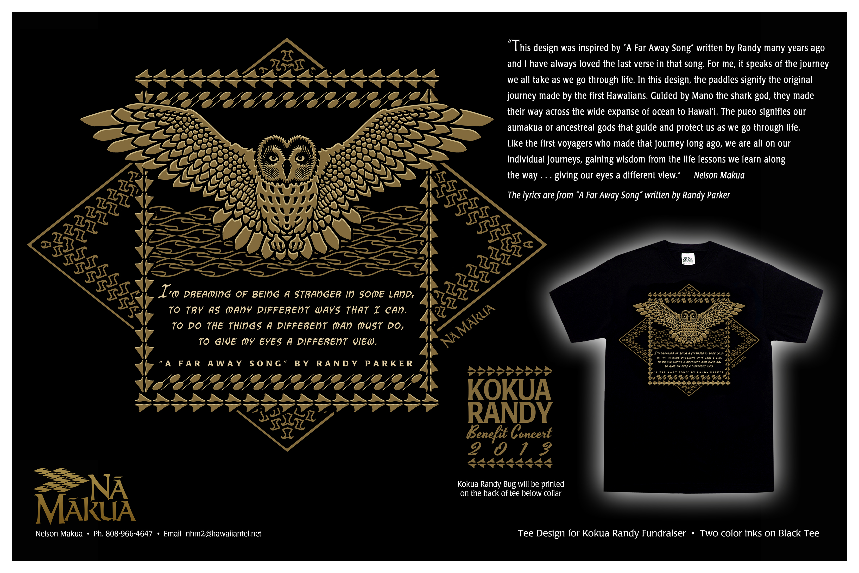 Now, friends are planning a benefit to help Parker cover extraordinary medical expenses for his treatment. Kauahikaua’s wife, singer/musician Jeri Gertz, lined up musicians who are donating their talent for a day long concert. Nelson Makua designed a limited edition Na Makua T-shirt that features lyrics from one of Parker’s songs. The Tees will be on sale at the event and online at NaMakua.com.