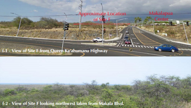 The much needed complex was originally slated to occupy “site G” (see map below) – state lands across from the West Hawaii Civic Center and next to the Kona’s planned regional park complex. Now, the complex will move south to Site F, a 10 acre parcel in Keahuolū known as the Makalapua Center site for its proximity to the sizable shopping development.