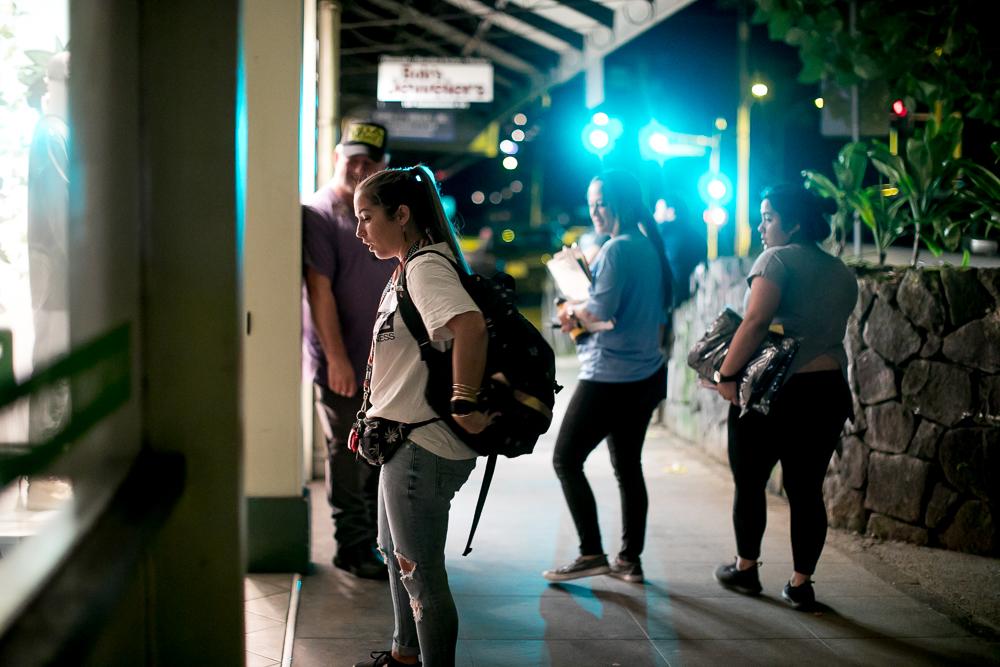HOPE Services Housing Navigator Alyssa Souza offers food and supplies to a person taking refuge in a storefront on Hilo Bayfront, as colleagues Steven “Happy” Stachurski and Carrie Hoʻopiʻi, and volunteer Reisha Hoʻopiʻi look on. (Jan. 27, 2020)
