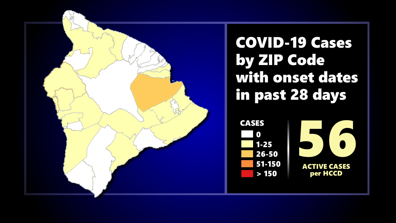 (BIVN) – There are fifty-six (56) active cases of COVID-19 on Hawaiʻi island, the Hawaiʻi County Civil Defense reported in a Monday morning radio message. Four individuals are hospitalized with the coronavirus.