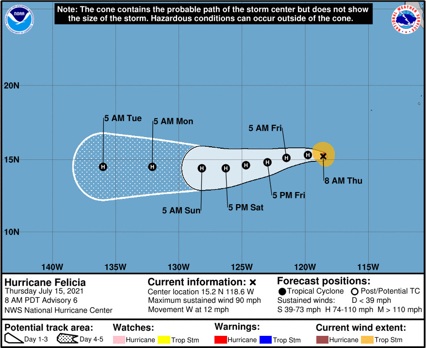 Local forecasts are not focusing on Felicia yet, other than to say the breezy trades over Hawaiʻi “will likely continue through the middle and latter part of next week, but details become a bit less clear as the gradient may be influenced by tropical systems moving into the Central Pacific basin from the east.”