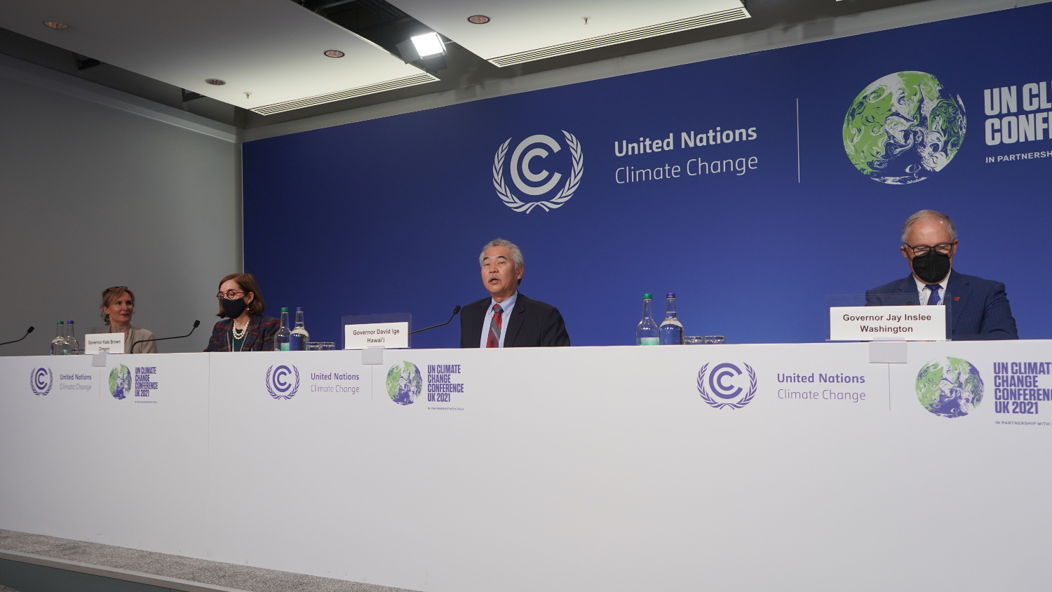 During a panel discussion in Glasgow called Role of States and Regions in the Climate Decade, Governor Ige joined Oregon Governor Kate Brown. He also took part in a press conference entitled U.S. Governors United on Climate Action and a Net-Zero Future with Gov. Brown, Washington State Governor Jay Inslee and Illinois Governor J. B. Pritzker. Governor Ige also participated in a U.S. Department of Energy panel discussion with DOE Deputy Secretary David Turk.