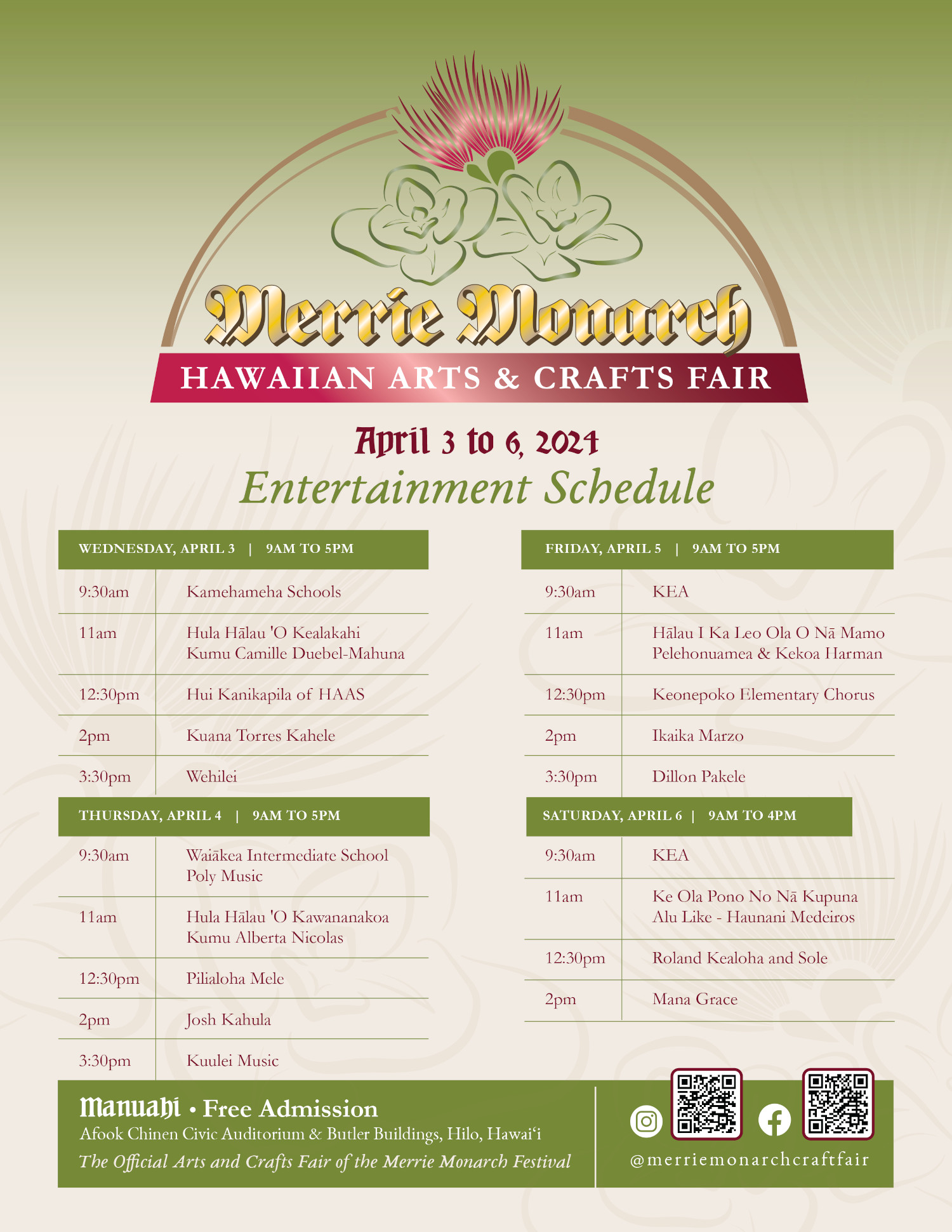 For more information, follow Merrie Monarch Arts & Crafts Fair on Facebook and Instagram@merriemonarchcraftfair or visit merriemonarch.com.