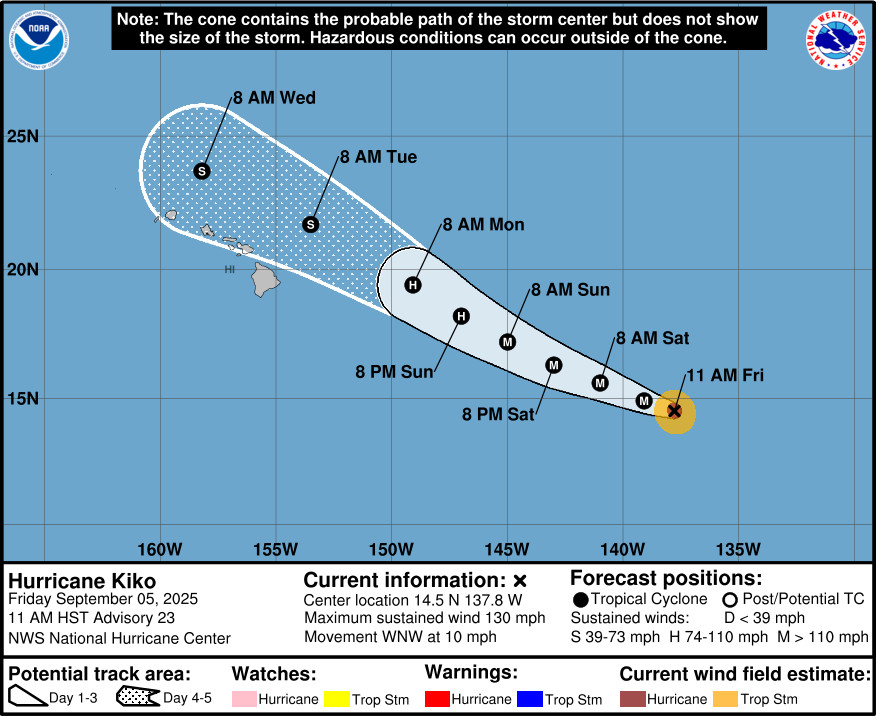 “The track of Kiko will be determined by the drier Central Pacific environment it will be moving into the next couple of days as well as its interaction with increasing southwesterly shear” from a trough north of Hawaiʻi, the National Weather Service in Honolulu reported on Friday.