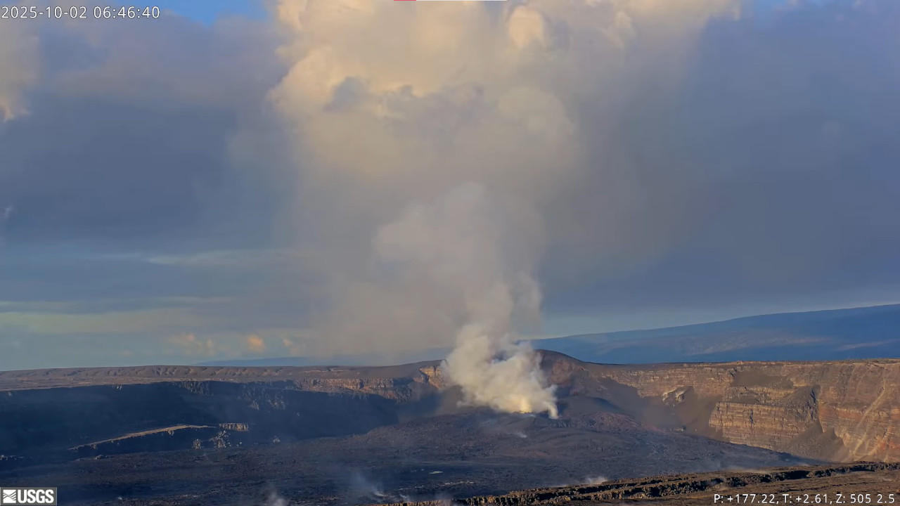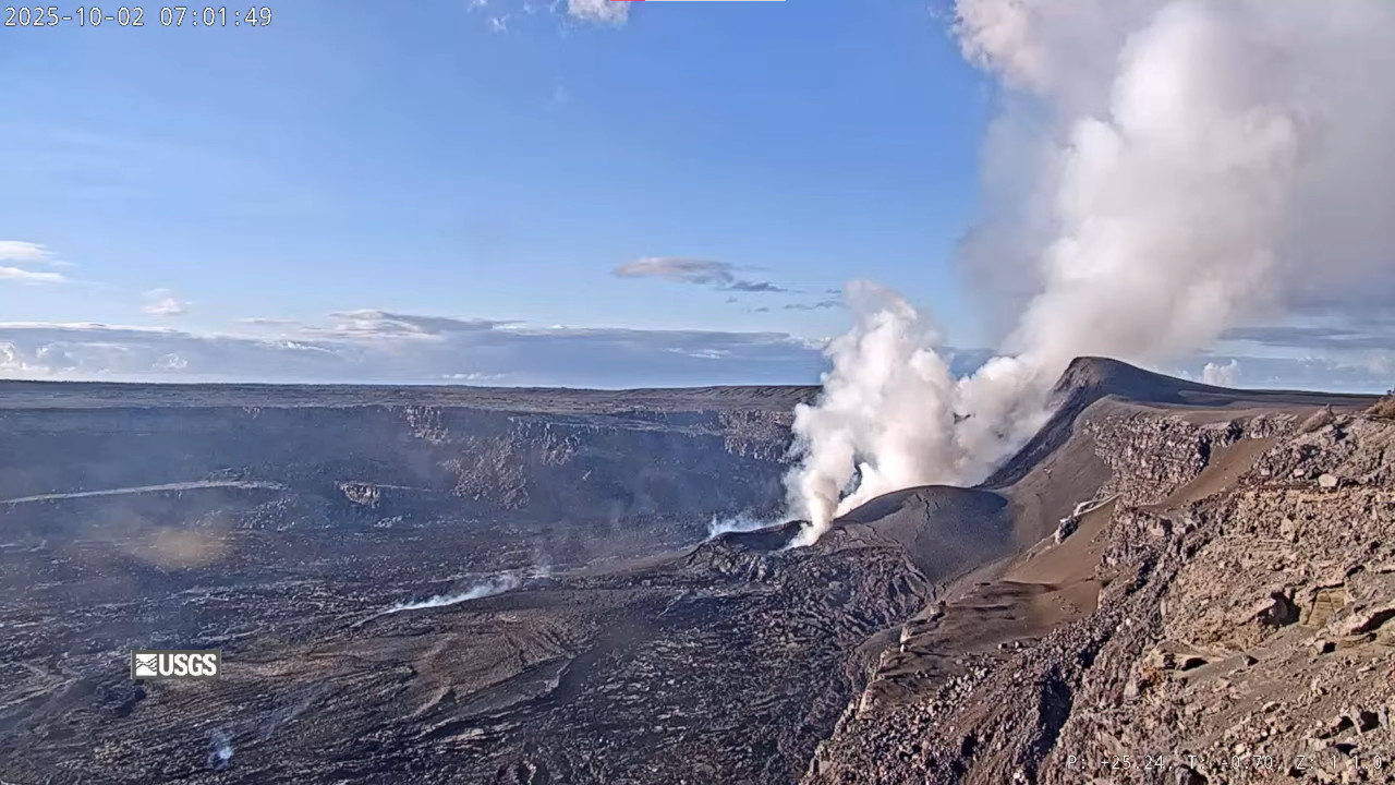 Episode 34 precursory activity began at approximately 9:47 p.m. HST on September 28, with gas pistoning events that produced small, sporadic spatter fountains 10 feet (3 meters) high, and numerous short overflows. Over 120 gas pistoning events occurred intermittently between then and 11:43 p.m. HST on September 30, when sustained overflows and low-level fountaining began within the north vent. Lava fountains within the north vent began to increase in size and volume along with the onset of deflation at 12:53 a.m. on October 1, marking the start of episode 34. Lava fountains from the north vent increased in vigor quickly, reaching up to 330 feet or 100 meters and were inclined slightly to the northeast. At 1:45 a.m. HST on October 1, the south vent began erupting and became the dominant fountain as the episode progressed, reaching vertically up to an estimated 1300 ft (400 m). Fountaining from both vents persisted for just over 6 hours but gradually declined in height. The two vents generated lava flows that covered a large portion of the western part of Halemaʻumaʻu crater floor with channelized lava flows. The south vent stopped erupting at approximately 7:00 a.m. and the north vent followed shortly after at 7:03 a.m. HST, marking the end of episode 34. Deflationary tilt at UWD totaled approximately 26 microradians during the fountaining, with an estimated volume of approximately 12 million cubic yards (9 million cubic meters or 2.5 billion gallons) of lava erupted overnight. The dual fountains also produced a record combined effusion of 500 cubic yards per second, about twice the maximum eruptive rate measured in previous episodes. After eruptive activity ceased at 7:03 a.m. HST, the caldera this morning has been quiet with a passive outgassing plume rising from the vents. Scattered incandescence on the lava flow field, due to residual heat, may continue in the coming days as these recently erupted deposits cool over time. Currently the UWD tiltmeter shows that inflationary tilt has resumed since the end of episode 34, with less than a microradian recorded so far.