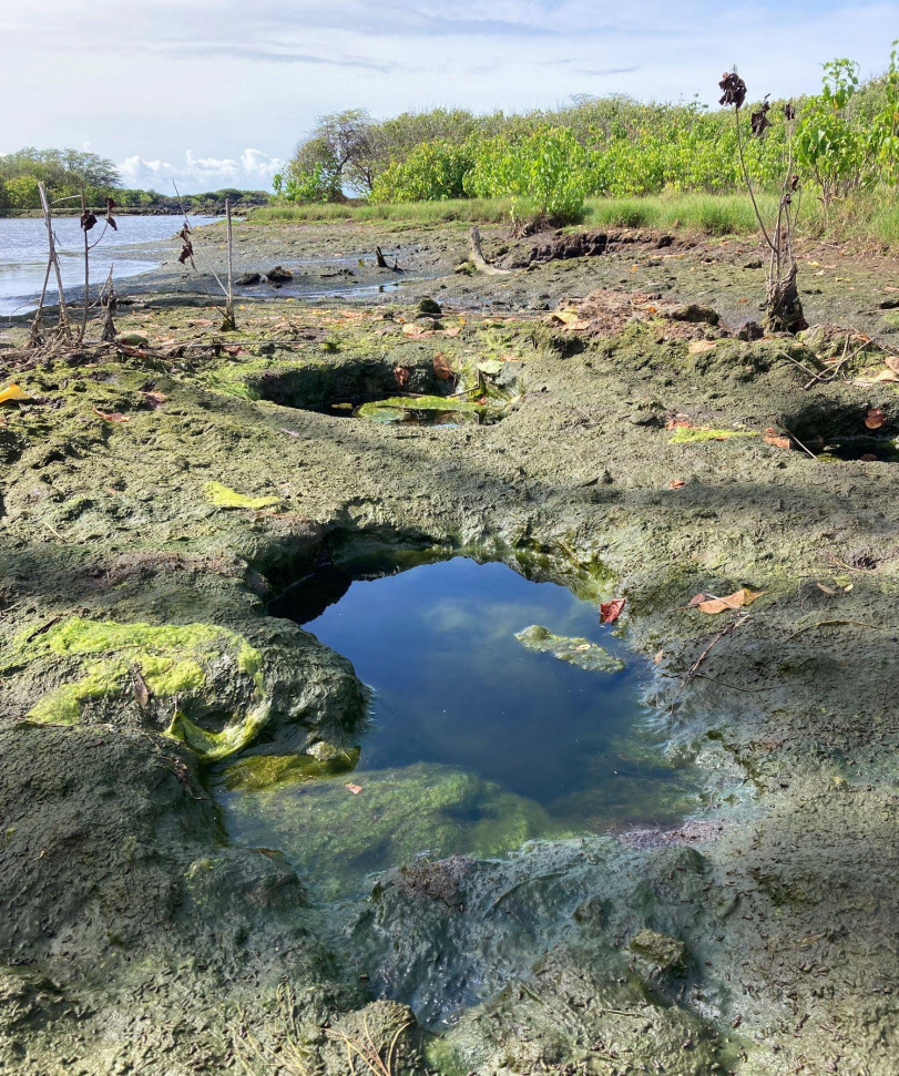 Figure 4: View of the wetland edges and mud flats, sites of freshwater springs, and Cladophora limu at the south end of the estuary. Photo By: Ka ʻOhana O Honuʻapo. (from the Honu‘apo Estuary Wetland Restoration Project – Draft EA)