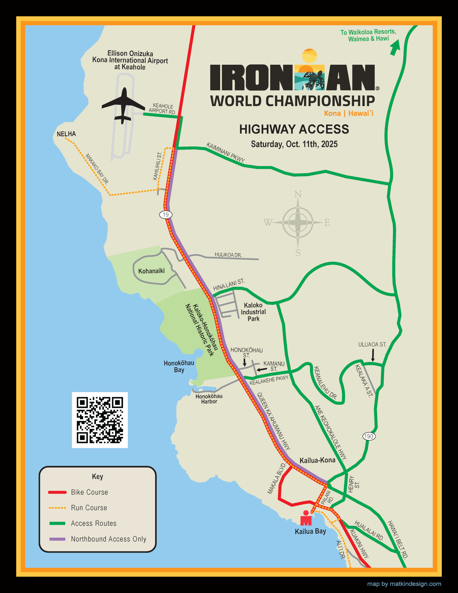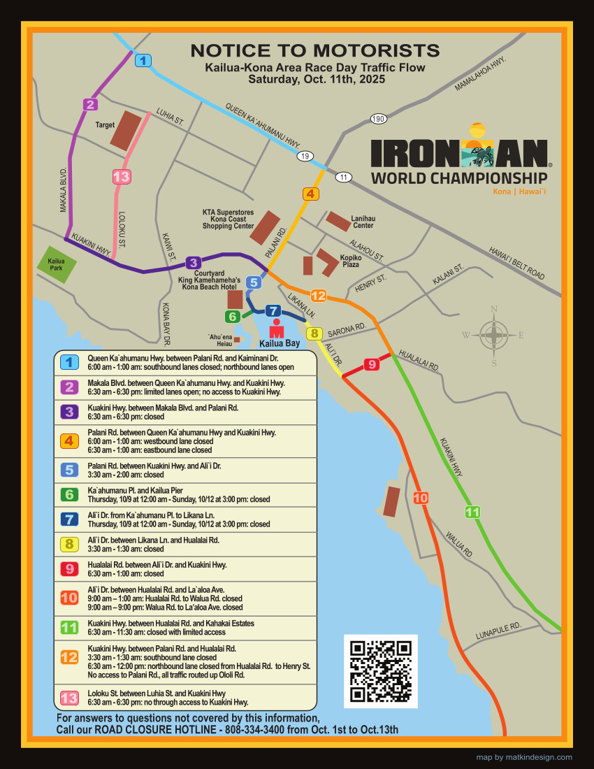 - Ali‘i Drive: Portions closed for athlete transitions, race start, and finish line activities.
