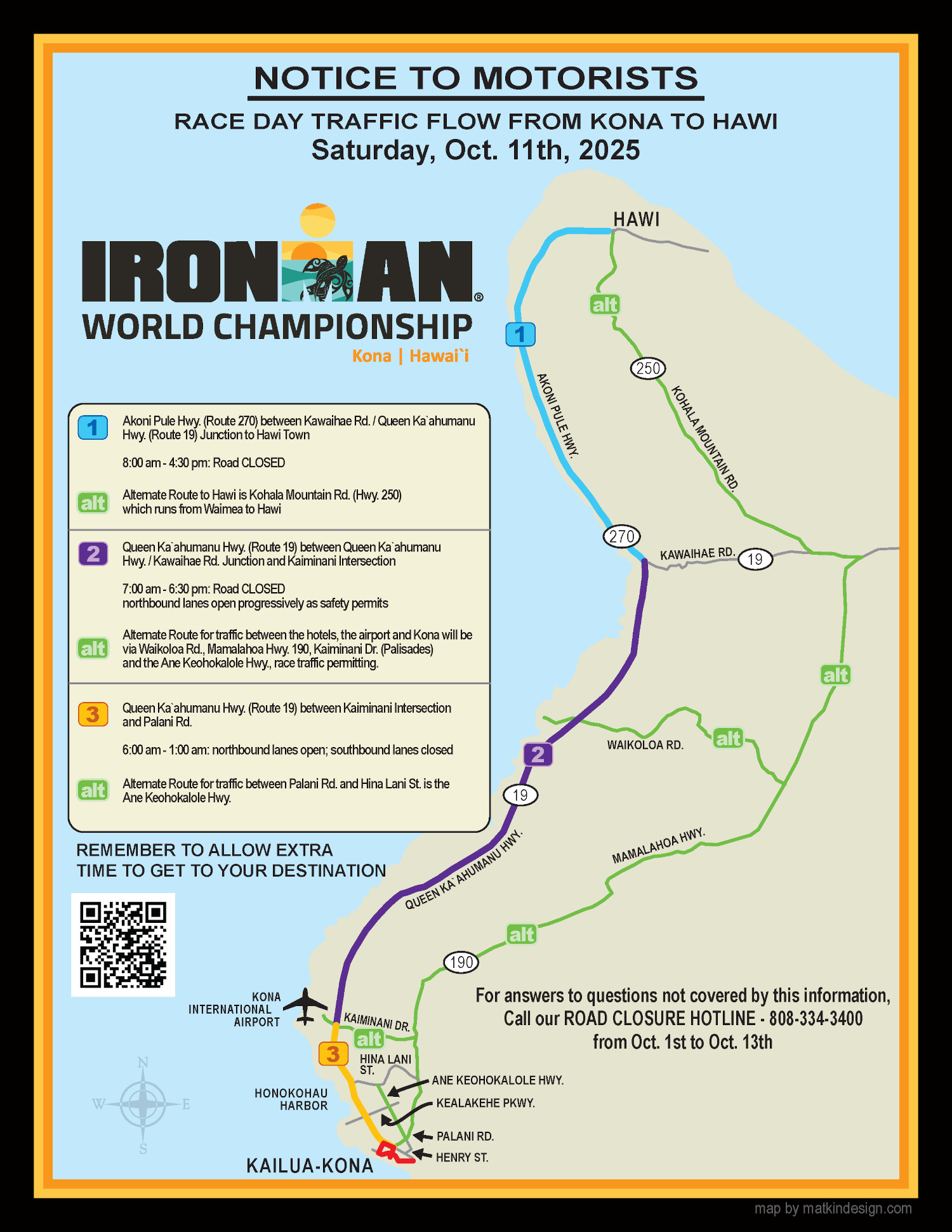 - Queen Ka‘ahumanu Highway: Restricted lanes during cycling portions of Saturday’s race.