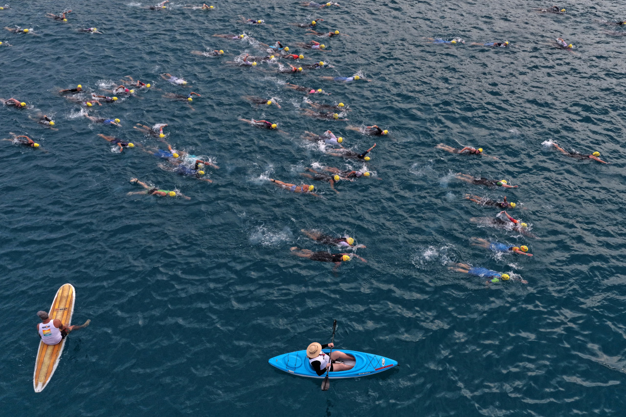 An aerial view of athletes competing in the swim portion during the 2025 IRONMAN World Championship Women’s Race on October 11, 2025 in Kailua Kona, Hawaii. (Photo by Ezra Shaw/Getty Images for IRONMAN)