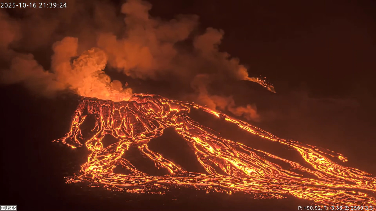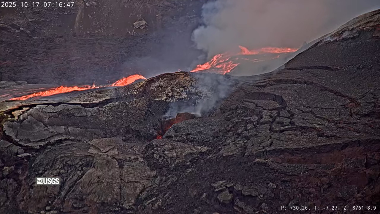 Precursory low-level activity for episode 35 of the ongoing Halemaʻumaʻu eruption increased yesterday, October 16. Twenty-five south vent overflow-drainback events occurred over the past 24 hours. Each overflow produced lava flows that flowed onto the crater floor. Each overflow ended with lava suddenly draining back into the south vent. Similar overflow-drainback events occurred during the lead up to previous fountaining episodes. Vigorous intermittent lava spattering has occurred at the north vent over the past 24 hours. More overflows, drainbacks, spattering and small fountains are expected as we approach the onset of episode 35 sustained fountaining. Seismic tremor and inflationary tilt continued at the summit over the past 24 hours. Forecast models based on the rate of summit inflation indicate that episode 35 lava fountaining is likely to begin between today, October 17, and October 22, with the most likely window between tomorrow and October 20.