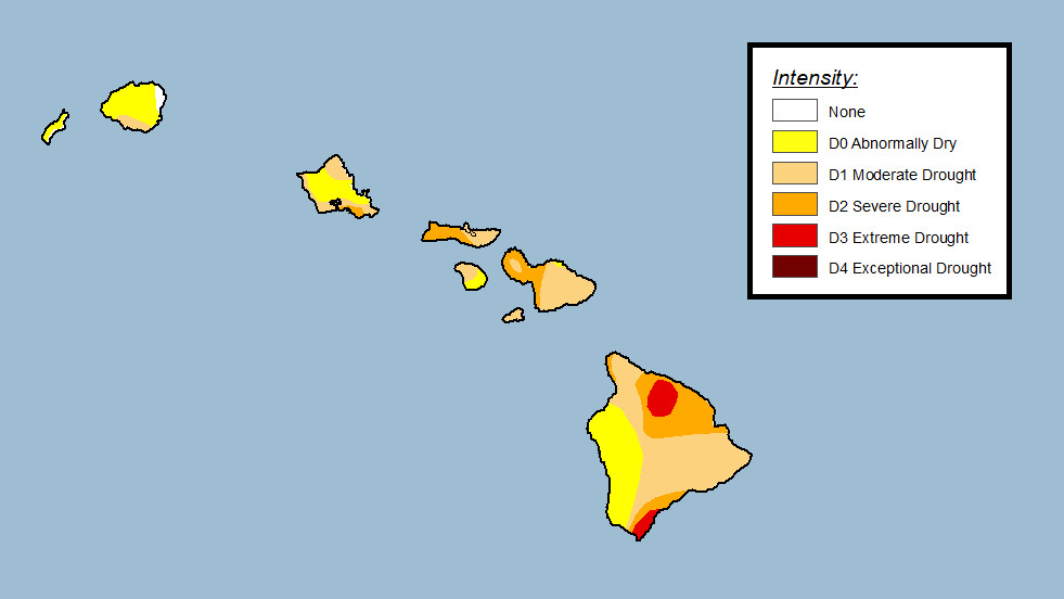 Coming out of the dry season, Hawaiʻi island was experiencing widespread D1 Moderate Drought drought, according to the U.S. Drought Monitor map, with pockets of D2 Severe Drought in Kaʻū, Hilo, and Hāmākua.