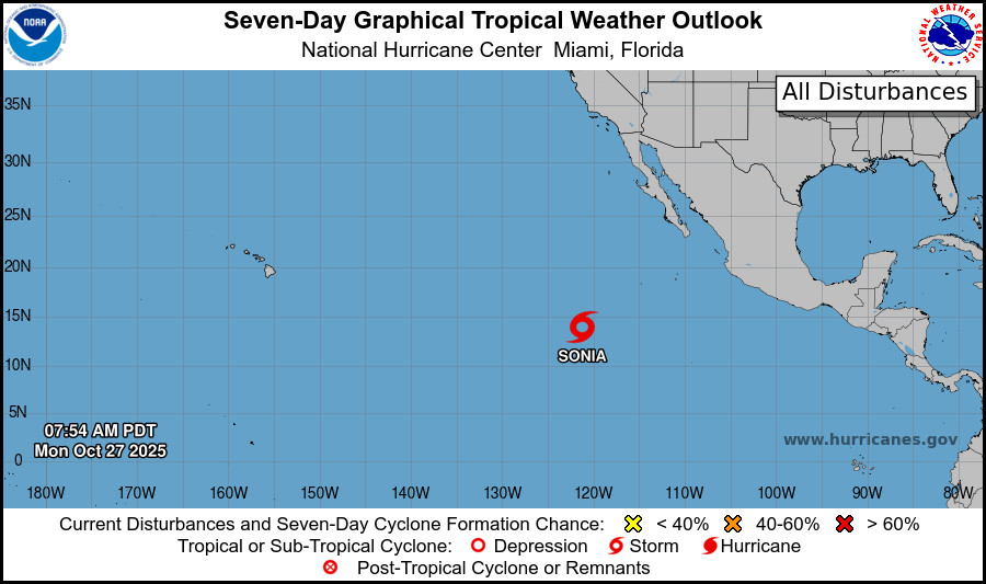 HAWAIʻI - Sonia is moving westward into an increasingly unfavorable environment, about 965 miles southwest of Baja California.