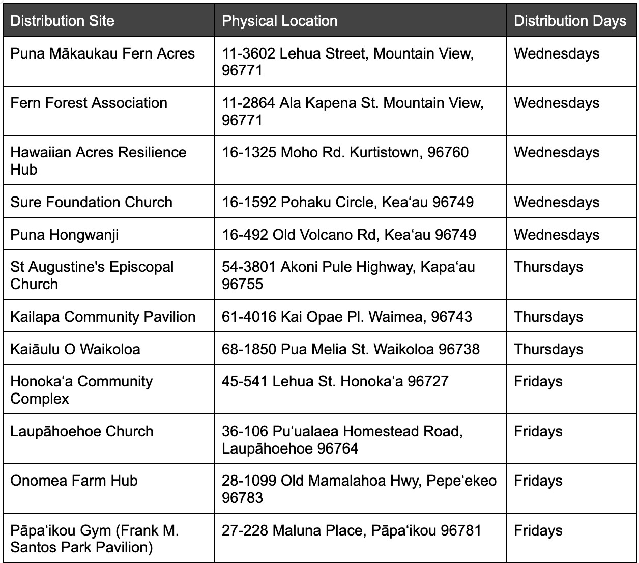 For residents in other areas of the island, The Hawaiʻi Island Food Basket will conduct ʻOhana Food Drops in Hilo, Pāhoa, Nāʻālehu, Kona, and Waimea. For more information, visit hawaiifoodbasket.org.
