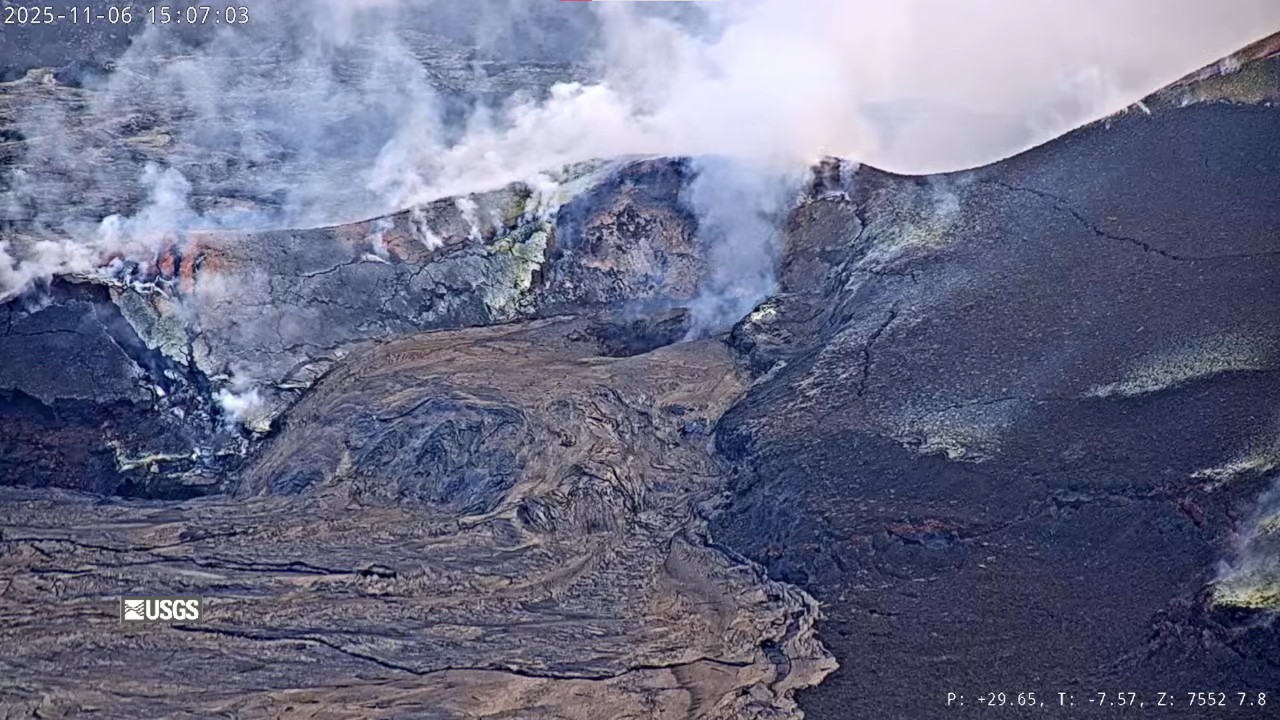 Since 4 a.m. HST this morning there has been a pause in overflow activity at the north and south vents. Preceding this period, the north vent produced a number of large overflows with many of these events developing hemispherical dome fountains. Overflows and the dome fountains had very little spattering until drainback, indicating that mostly degassed magma is being erupted at this time.
