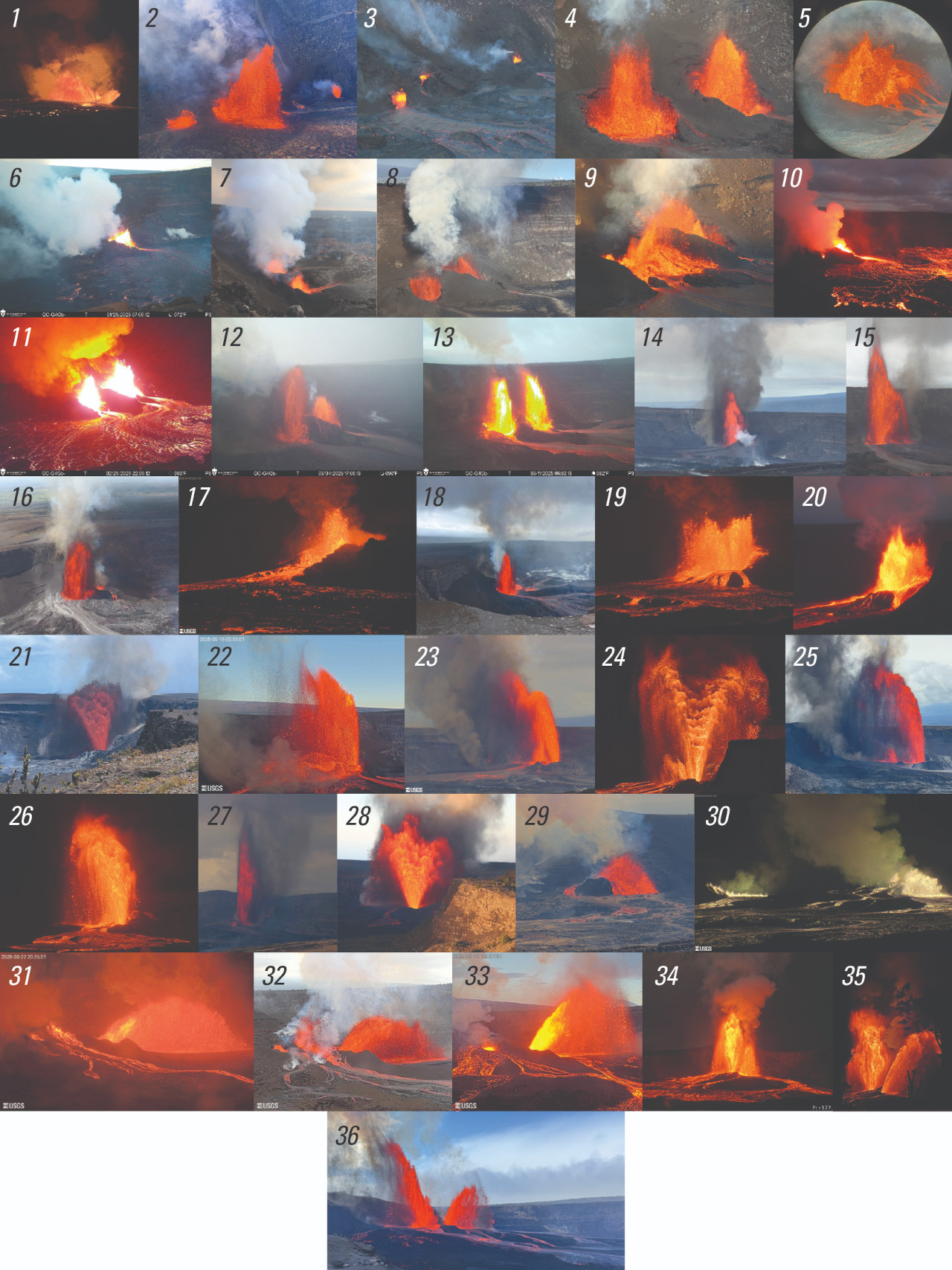 Photo compilation of episodes 1–36 of the ongoing eruption at the summit of Kīlauea, including webcam imagery and photos taken by USGS Hawaiian Volcano Observatory scientists on the ground and during helicopter overflights. In all photos except for episode 7, the south vent is on the left and the north vent is on the right. For the episode 7 photo, the north vent is in the center and the south vent is below it to the right. The episode 5 photo only shows north vent. The episode 30 photo also shows a fissure on the south wall that was active in the first few hours of the episode.