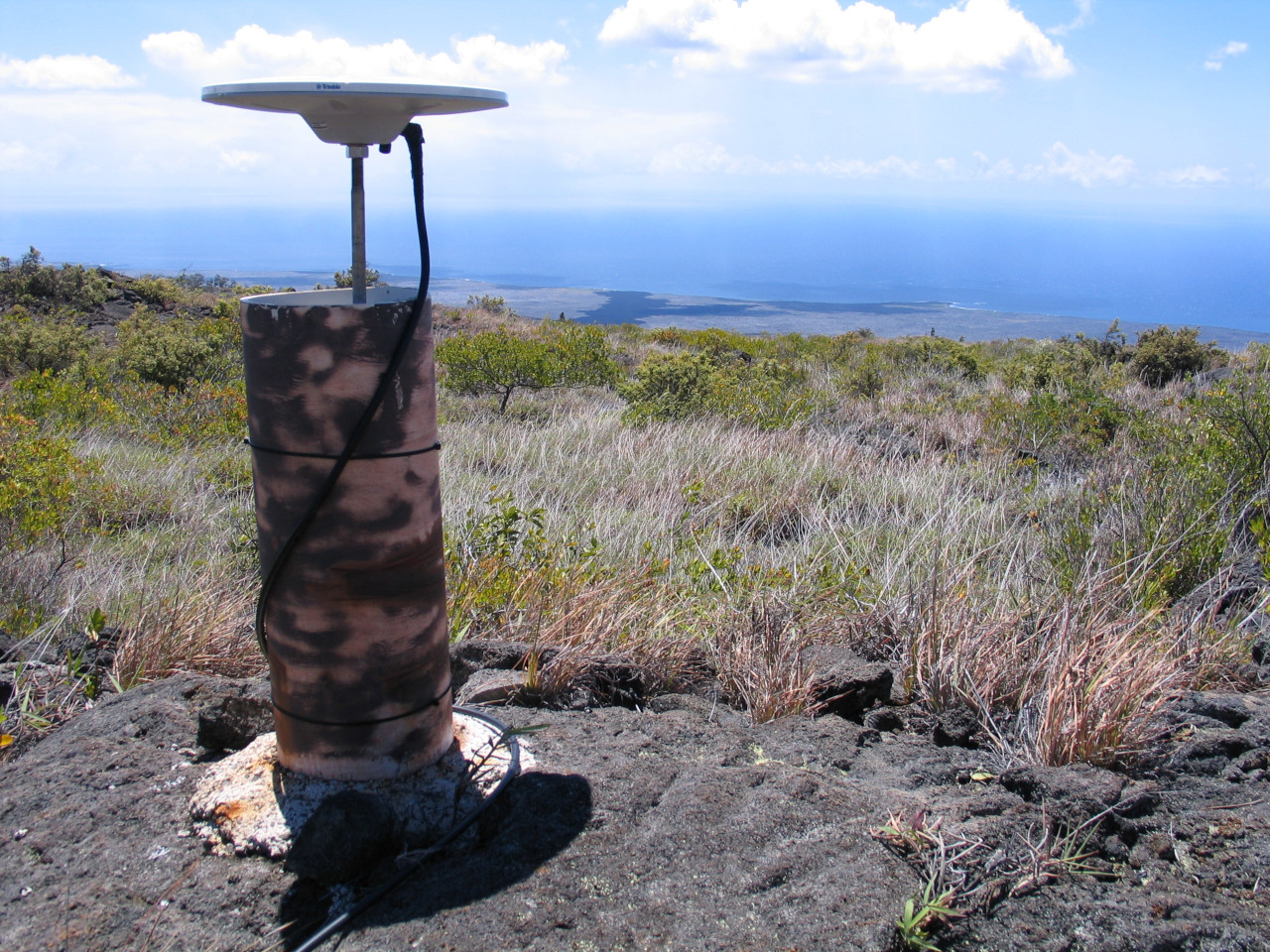 USGS: “The view from a continuous GPS station on Kīlauea’s south flank, looking over the Hilina and Hōlei Pali to the ocean. This instrument was installed in 1996 to monitor seaward motion of the south flank.” (USGS photo by K. Kamibayashi)