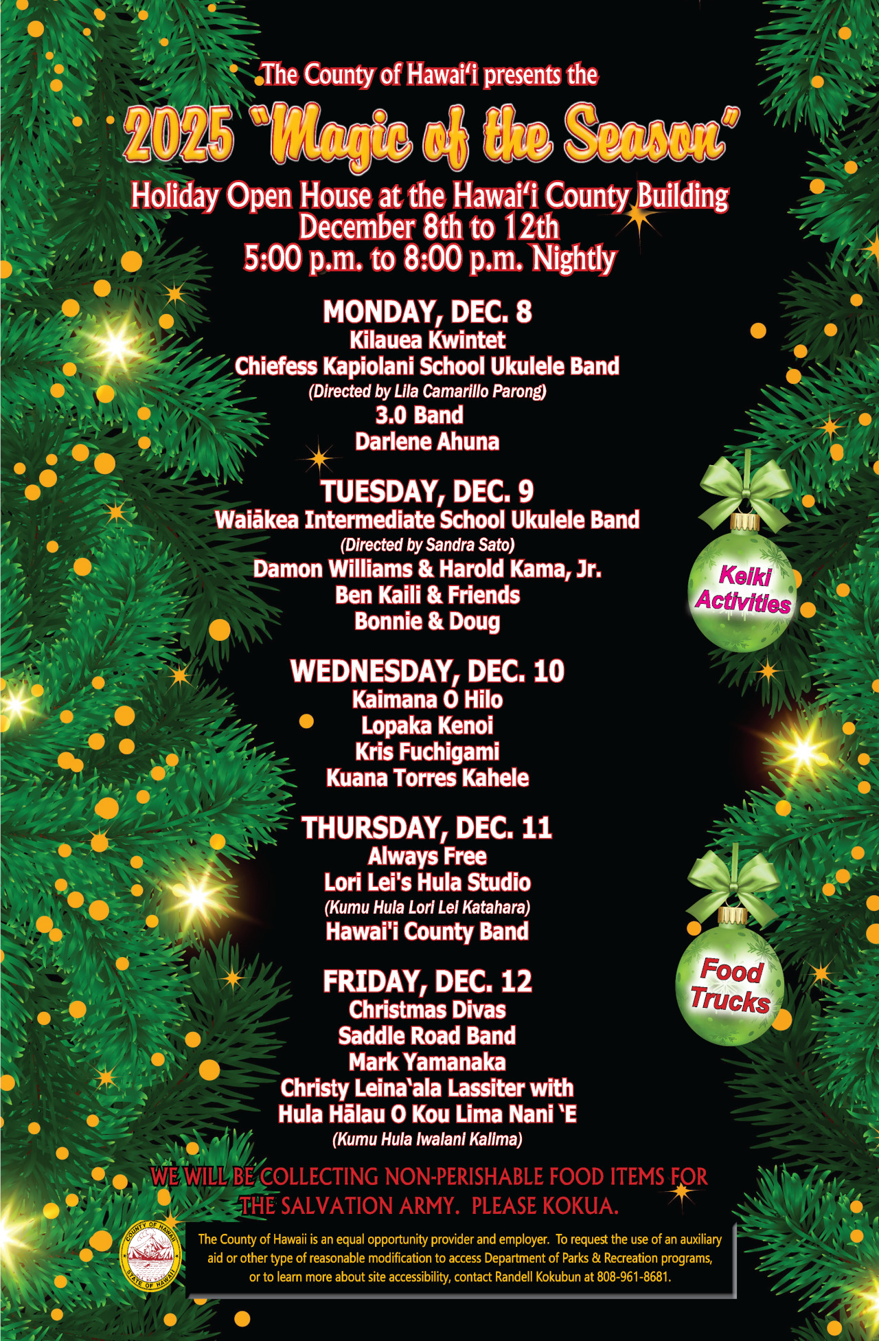 HILO, Hawaiʻi - The annual Holiday Open House at the Hawaiʻi County Building will run from Monday, December 8th, to Friday, December 12th.