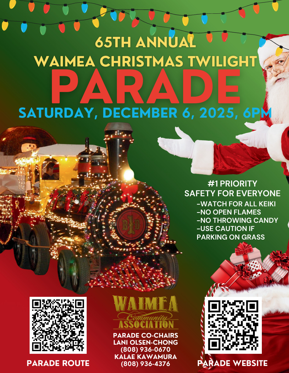 Thus, as Hawai’i’s second oldest Christmas Parade begins at 6 p.m., Sat., Dec. 6, 2025 for the 65th year, memories of the past and reflections about change and the people who have actively volunteered to help keep Waimea – well, Waimea – will be top of mind for many.