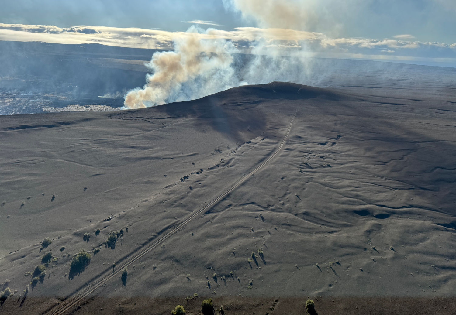USGS: “The north and south vents were degassing during a USGS Hawaiian Volcano Observatory monitoring overflight of Kīlauea summit on December 2, 2025. Eruptive activity at these vents was paused on December 2, following 9 hours of lava fountaining during episode 37 on November 25, but a spattering lava surface was visible deep within both vents.” (USGS photo by K. Mulliken)