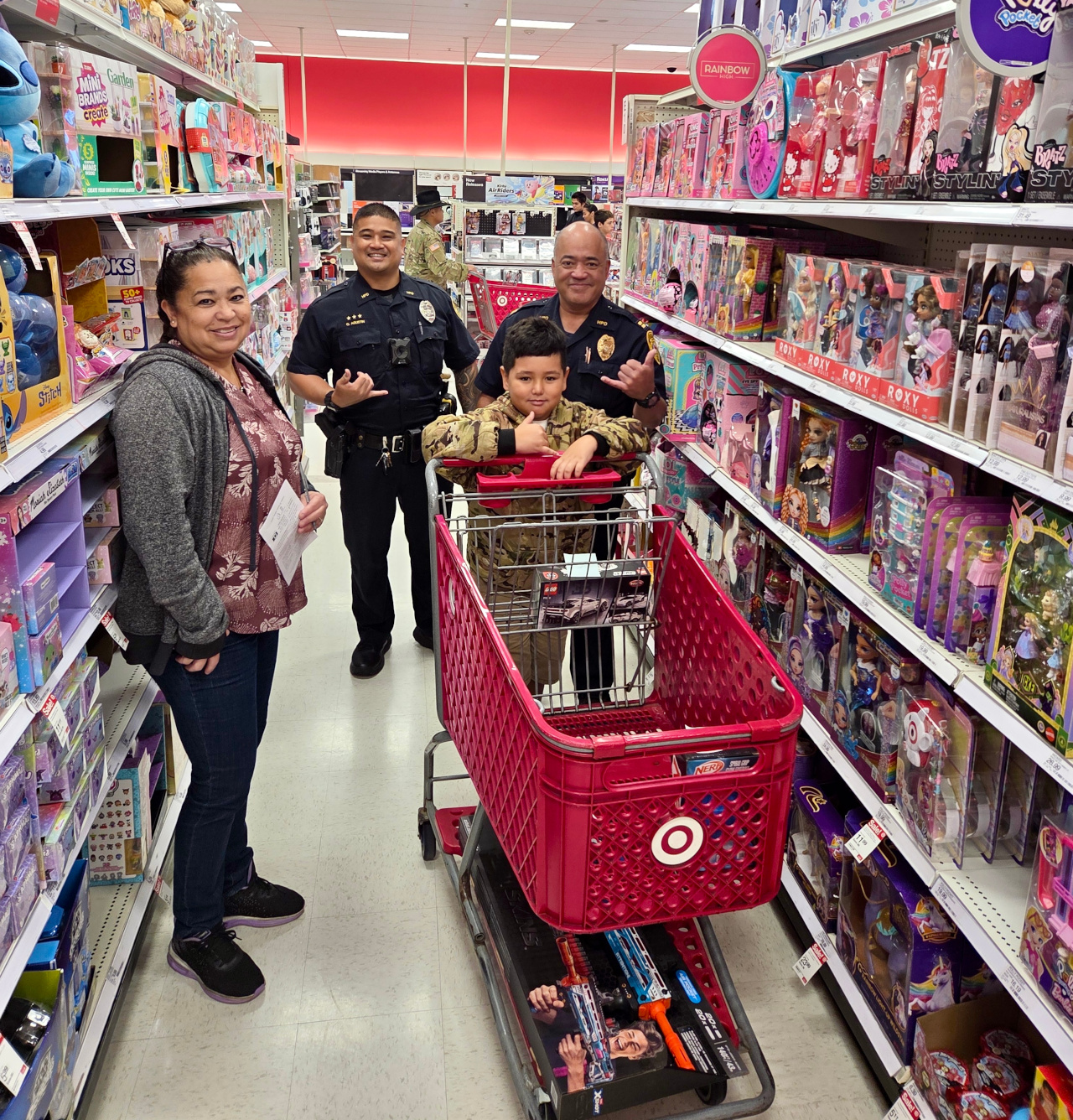 Each child was paired up with members of the Hawai‘i Police Department, Hawai‘i Fire Department, Hawai‘i Air and Army National Guard, State Department of Land and Natural Resources, and other agencies. Every participant received a $125 Target gift card, made possible by donations from Catholic Charities Hawai‘i, Target Corporation, and others listed below. Community volunteers also gift-wrapped the items selected by the children.
