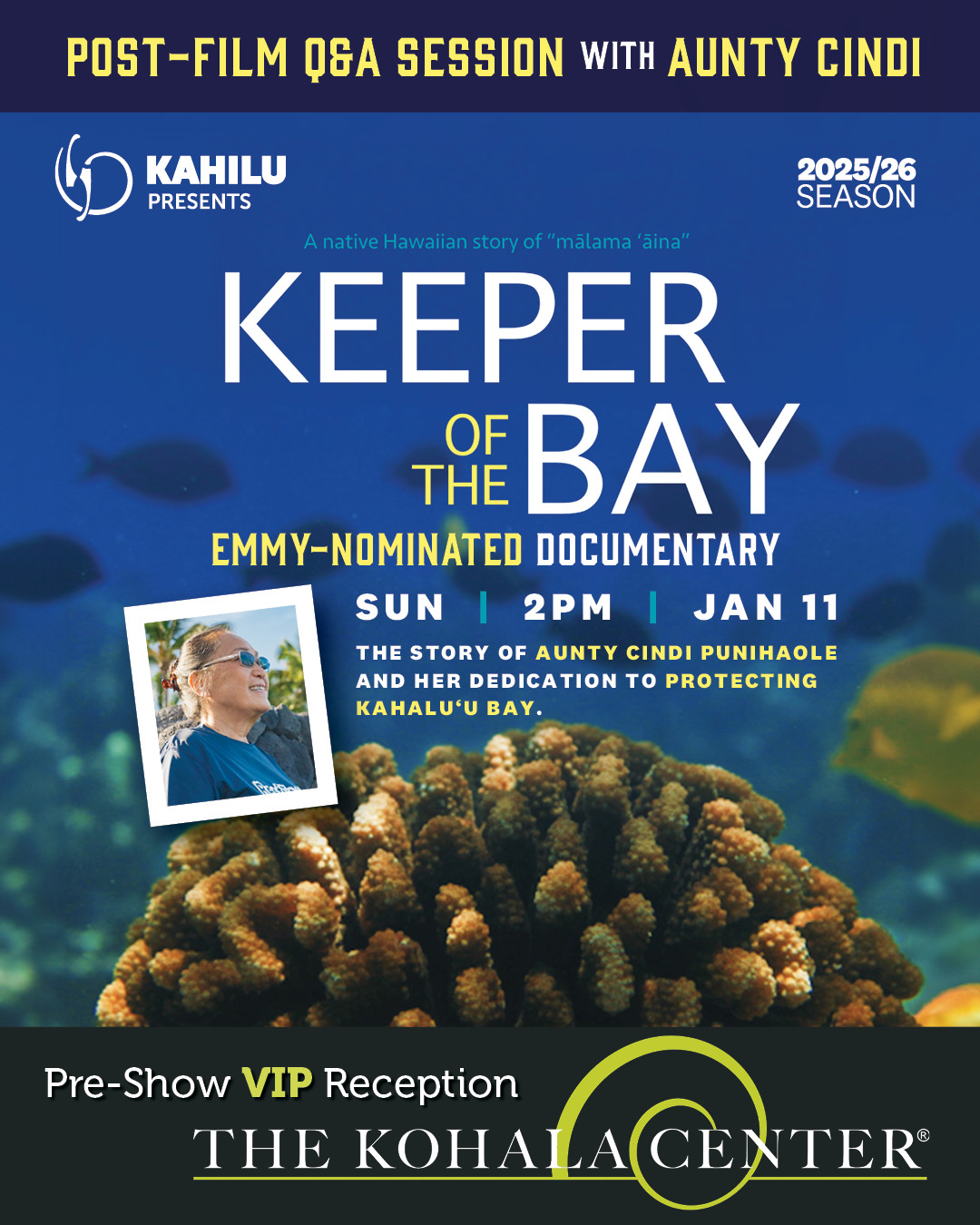 WAIMEA, Hawaiʻi - The Emmy-nominated documentary featuring the efforts of Cindi Punihaole to preserve Kahaluʻu Bay will show at Kahilu Theatre on January 11th.