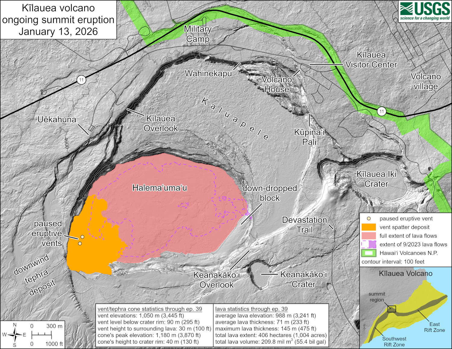 This USGS reference map depicts the Kīlauea summit eruption within Halema‘uma‘u crater that began on December 23, 2024. The data for this map were collected during a Hawaiian Volcano Observatory helicopter overflight on January 2, 2026; as such, the provided statistics are reflective of the first thirty-nine episodes of the eruption through December 24, 2025. Note that the map shows a significant expansion of the vent spatter deposit, which is the result of more comprehensive mapping of the episode 38 deposit in the southwest corner of Halema‘uma‘u. Additionally, the provided eruption statistics indicate a maximum lava thickness lower than that in previous maps; reanalysis of earlier overflight data showed that thickness measures near the eruptive vents were affected by the emitted volcanic gas plume. This has now been corrected for, and the new maximum lava thickness value should be considered more accurate at present.