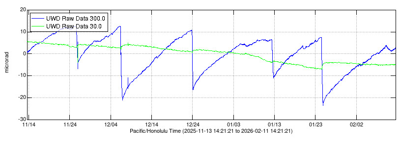 USGS: “Electronic Tilt at Kīlauea summit – Past Three Months. The different colored lines show tilt in a specific direction at a specific station (see the legend in upper left corner of each plot). Station UWD is located near Uēkahuna, on the western rim of Kīlauea’s summit caldera. These data are recorded by continuously operating electronic tiltmeter. Positive changes often indicate inflation of the magma storage areas beneath the caldera of Kīlauea, but may also result from heavy rainfall or, occasionally, instrumental malfunctions.” Note the dip, and rebound, on the right side of the graph, plotting the recent deflation at the summit.