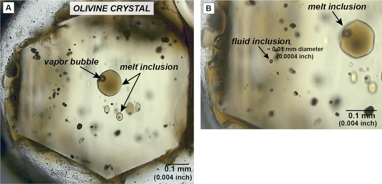 Image of an olivine crystal taken with a petrographic microscope. A) Olivine with melt inclusion (honey color) with a vapor gas bubble inside it (black circle). B) Zoomed in view of olivine highlighting a fluid inclusion (black circle, white dot in center) and a melt inclusion. (USGS images)