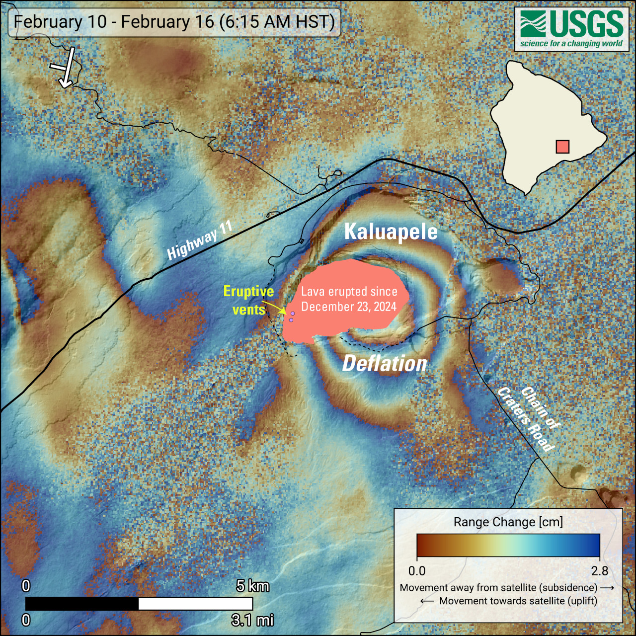 USGS: “This map shows recent deformation at Kīlauea, over the timeframe of February 10–16, 2026. Data were acquired by the European Space Agency’s Sentinel-1A/C satellites. Each color cycle represents 2.8 cm (1.1 in) of ground movement in the direction between the satellite and the ground (range change). The symbol in the upper left indicates the satellite’s orbit direction (arrow) and look direction (bar). The lava flows covering the crater floor are represented by the pink polygon, the two vents (circles) are marked in purple. This radar interferogram spanning episode 42 shows round fringes within and around Kaluapele (Kīlauea summit caldera) indicating ground surface deflation over the time period spanned by the images as magma was withdrawn from the Halemaʻumaʻu magma chamber at a depth of approximately 1.5 kilometers (1 mile) below the ground surface.”