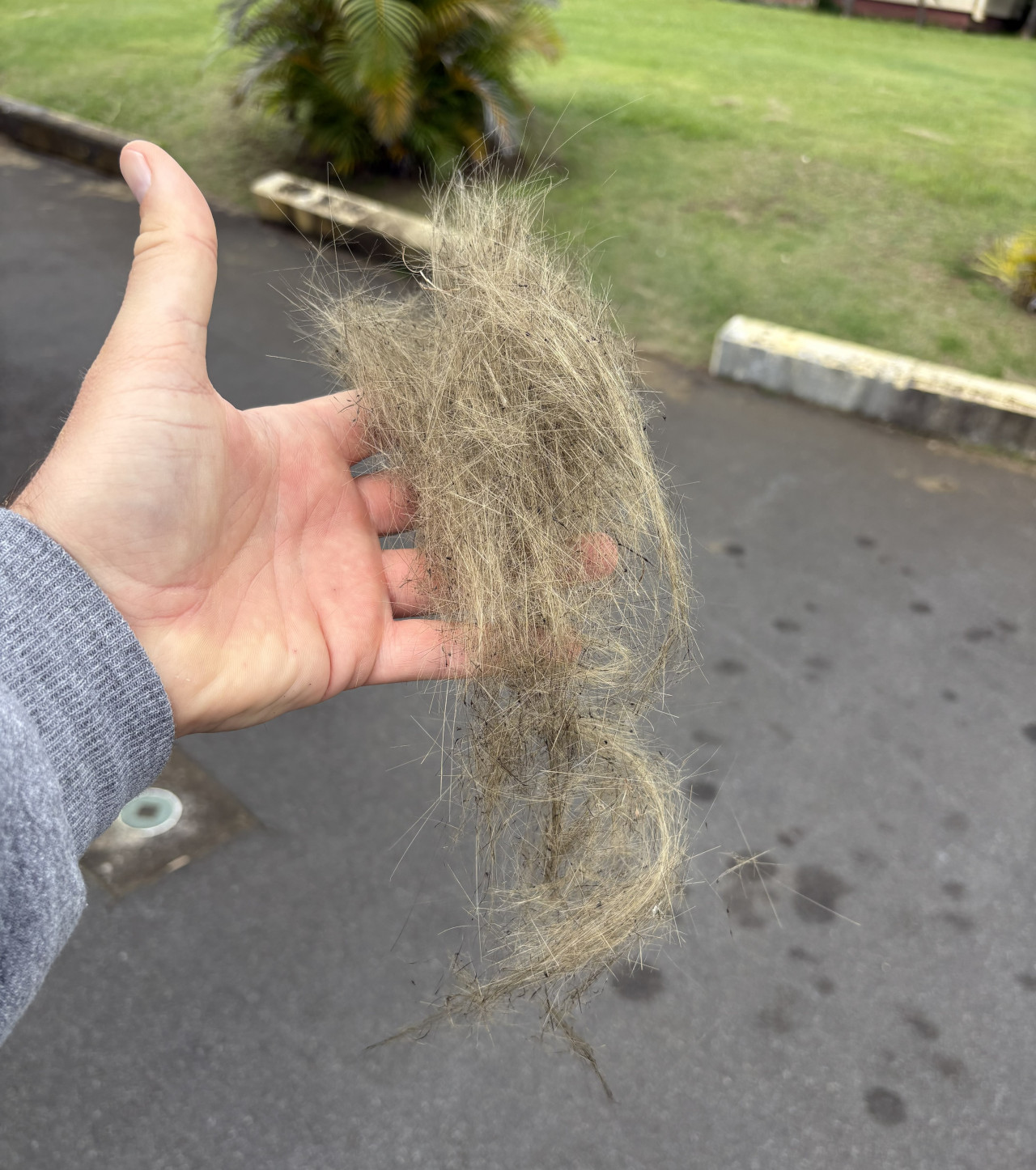 USGS: “Long strands of Pele’s hair, which is made of volcanic glass, drifted on the wind to the southwest during episode 42 of Kīlauea summit lava fountaining on February 15, 2026. This photo shows a bundle of these long strands of Pele’s hair after they had blown around in the wind in the community of Pāhala and became tangled up.” (USGS photo by D. Downs)