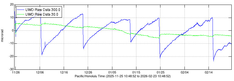 USGS: “The different colored lines show tilt in a specific direction at a specific station (see the legend in upper left corner of each plot). Station UWD is located near Uēkahuna, on the western rim of Kīlauea’s summit caldera. Station POC is located on the north rim of Pu‘u‘ō‘ō cone on the middle East Rift Zone of Kīlauea. These data are recorded by continuously operating electronic tiltmeters. Positive changes often indicate inflation of the magma storage areas beneath the caldera or on the middle East Rift Zone of Kīlauea, but may also result from heavy rainfall or, occasionally, instrumental malfunctions.”