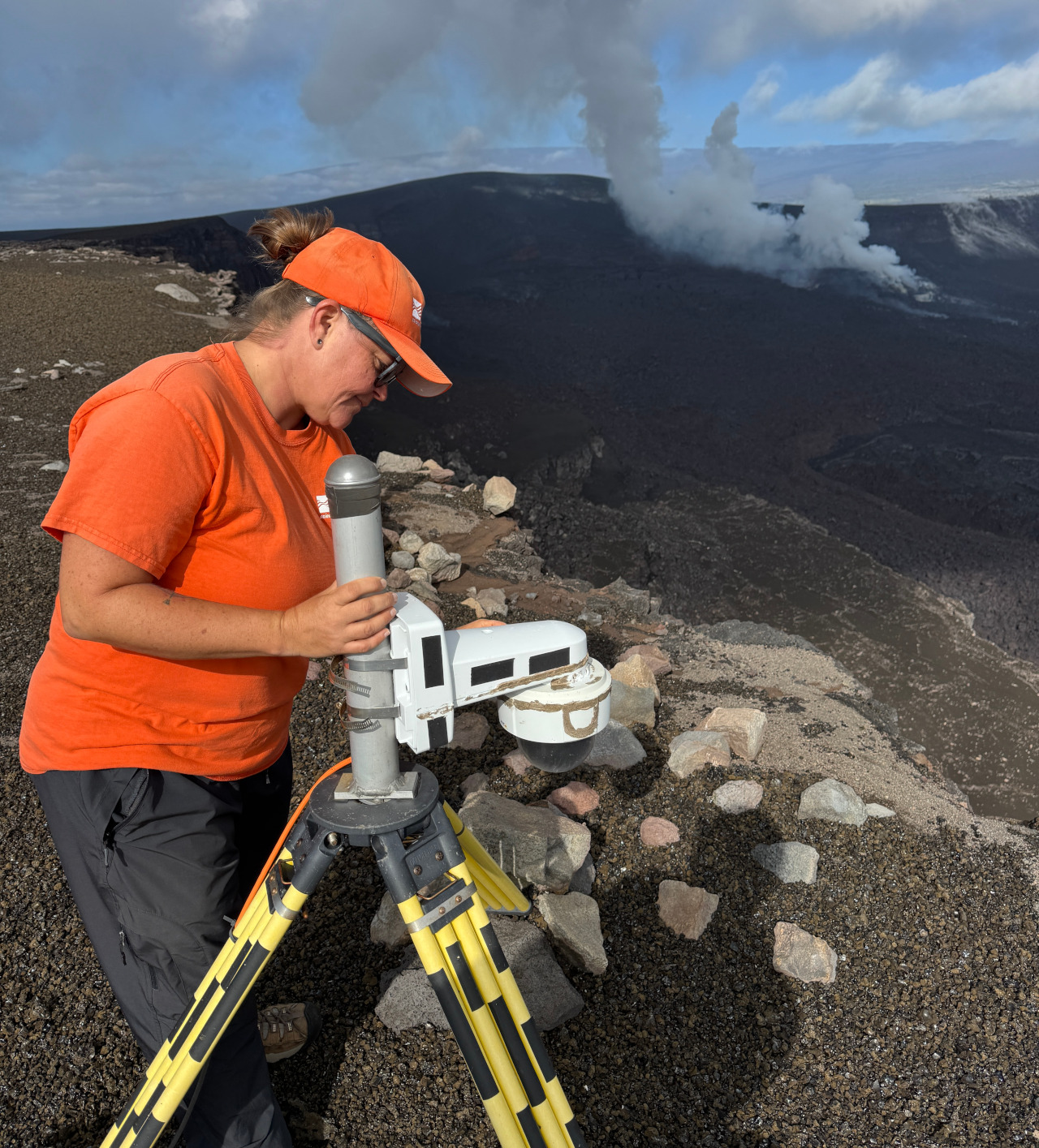On Thursday, the USGS Hawaiian Volcano Observatory flew a helicopter over the summit, where steady gas plumes could be seen emitting from the inactive vents. Geologists landed in the caldera to gather samples from the lava that erupted most recently.