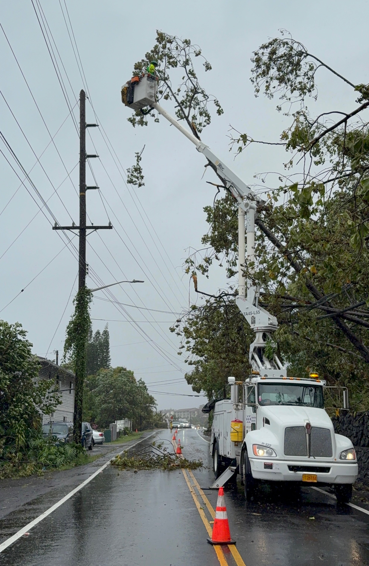Hawaiian Electric says more than 50 damaged or broken poles and multiple spans of downed lines have been identified. “Tree trimming crews continue to clear fallen trees and debris from roads so crews can access areas and make repairs,” a news release reported.