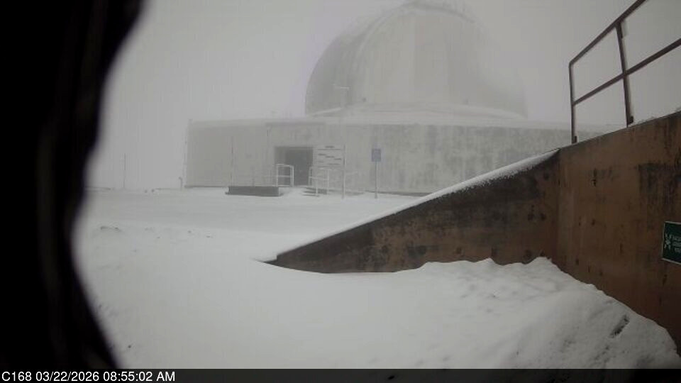Summit weather conditions are obscuring observatory webcams atop Maunakea, although a few are providing enough of a view to see the heavy snow. Total snow accumulations up to 10 inches were expected.