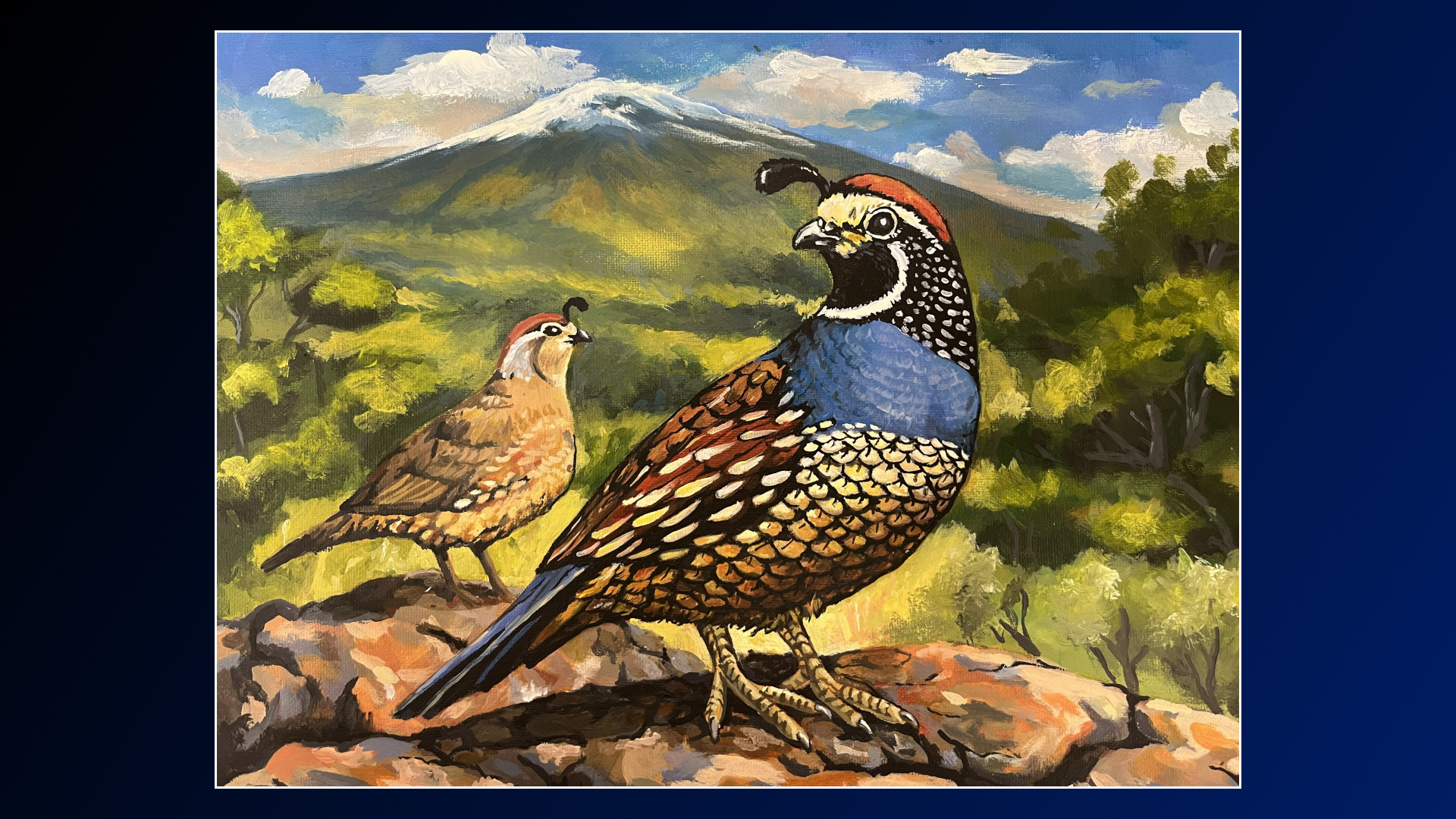 The Game Bird Stamp Winner, by Alvin Galvez, depicts male and female California Valley Quails perched on a rocky outcrop, set against a sweeping mountain backdrop.