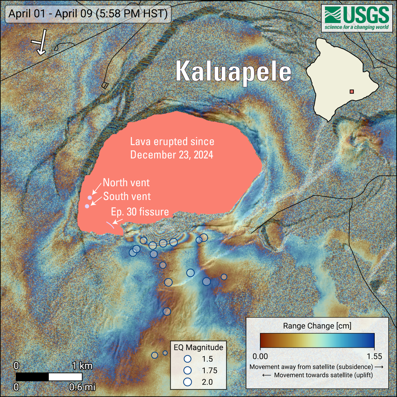 USGS: “COSMO-SkyMed Second Generation (CSG) interferogram for the period from April 1 to April 9, 2026, covering Kīlauea volcano’s summit region. Each color fringe represents 1.55 centimeters (0.61 inches) of ground movement in the direction between the satellite and the ground (range change). The symbol in the upper left indicates the satellite’s orbit direction (arrow) and look direction (bar). Earthquakes are marked with circles with the size proportional to their magnitude. The lava flows covering the crater floor are represented by the pink polygon, the two vents (circles) and the Episode 30 fissure (line) are marked in light pink.”