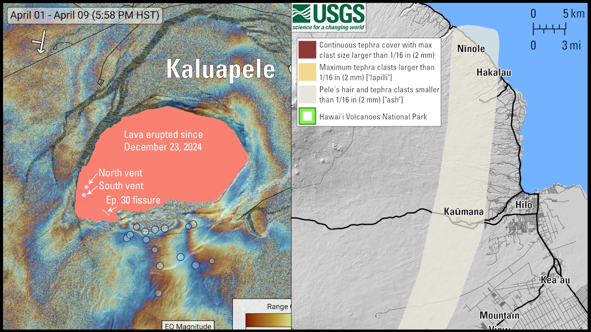 USGS: “This map shows the tephra fall associated with episode 44 of Kīlauea’s episodic summit eruption, on April 9, 2026. Tephra is a generic word for any material erupted by a volcano that travels through the air before landing on the ground. Most tephra fall from past lava fountaining episodes has landed in the closed area of Hawaiʻi Volcanoes National Park, southwest of the eruptive vents, with several instances of tephra fall documented in other communities on the island. During episode 44 on April 9, lava fountains from the north vent in Halemaʻumaʻu at the summit of Kīlauea reached up at 240 m (800 feet). Southerly winds blowing to the north-northeast resulted in tephra fall in a narrow corridor within Hawaiʻi Volcanoes National Park, on Highway 11, and on communities to the northeast within the Districts of Kaʻū, Puna, South Hilo, and North Hilo.”