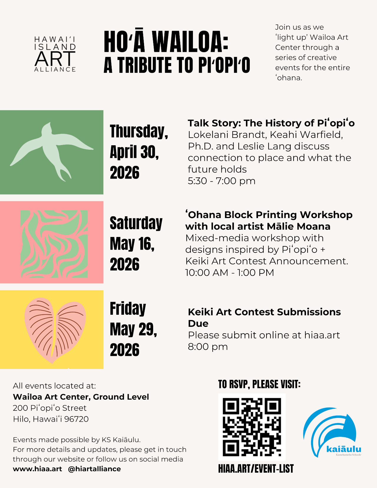 Insights from the Talk Story will inform and inspire an ‘Ohana Art Day on Saturday, May 16 from 10:00AM–1:00PM, featuring local artist and block printer Mālie Moana. Attendees are encouraged to bring items they would like to block print. The event is free and open to the public. During the May 16 event, HIAA will announce its Keiki Art Contest, encouraging original artworks inspired by the stories of Wailoa and the Pi‘opi‘o area.